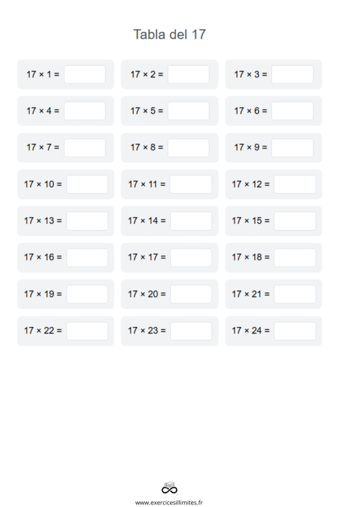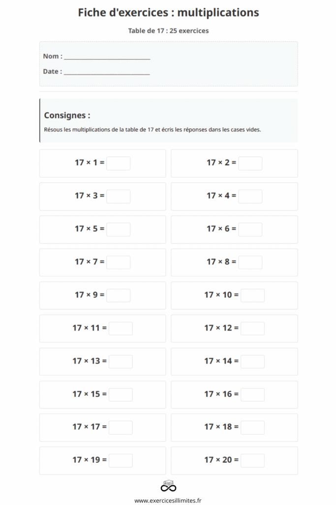 En complément, télécharge des fiches de la table de 17 multiplication. Elles contiennent des exercices progressifs, idéaux pour réviser à la maison ou en classe.