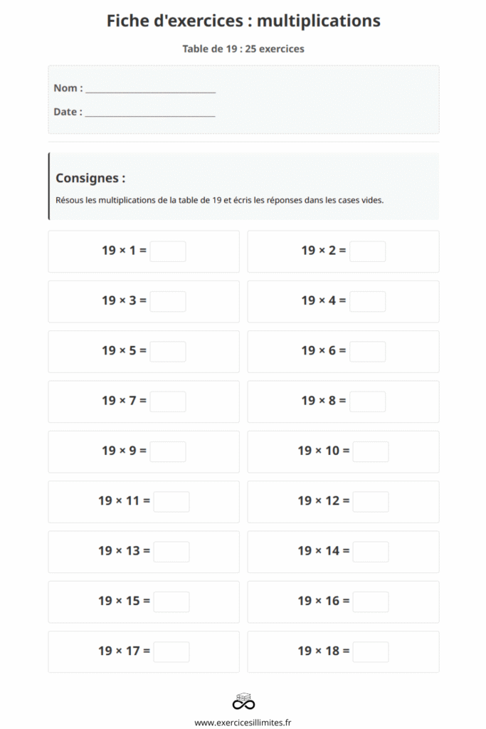 En complément, télécharge des fiches de la table de 19 multiplication. Elles contiennent des exercices progressifs, idéaux pour réviser à l’école ou à la maison.