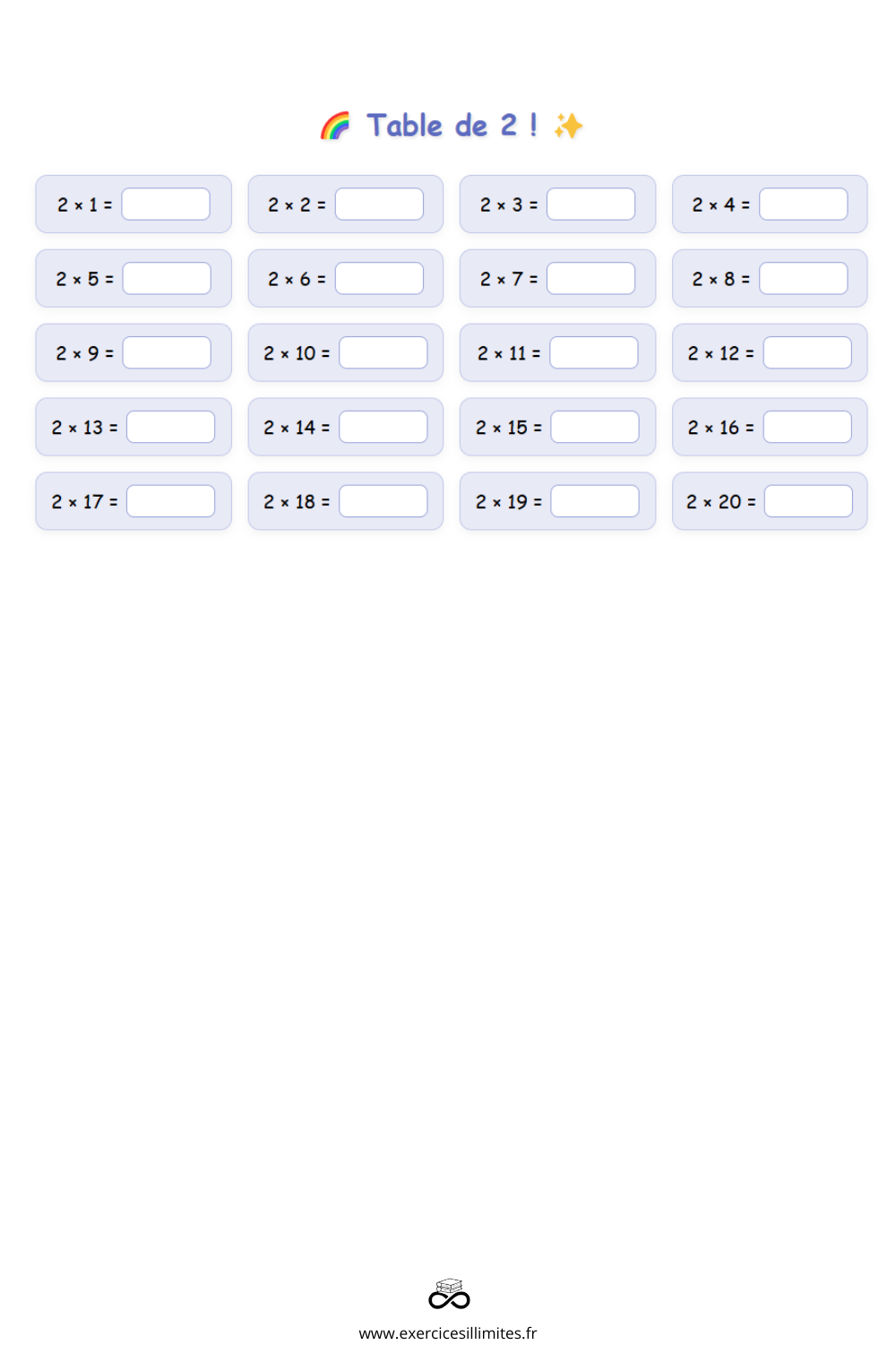En complément, télécharge des fiches de la table de 2 multiplication. Elles contiennent des exercices progressifs, adaptés pour l’école primaire et parfaits pour réviser à la maison.