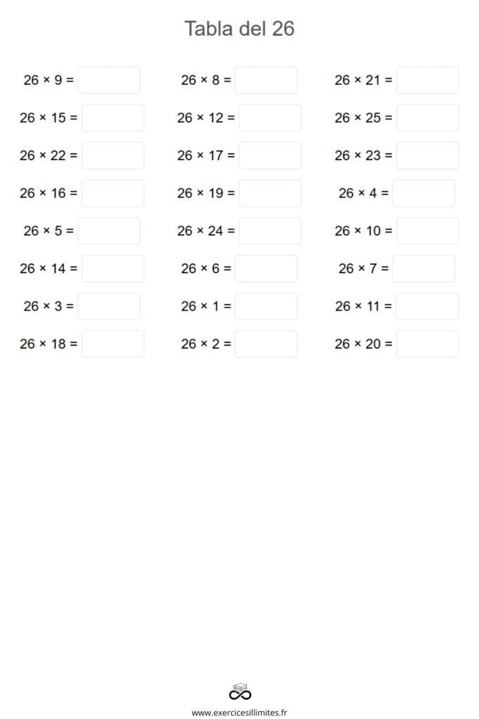 Table de multiplication de 26: exercices et fiches