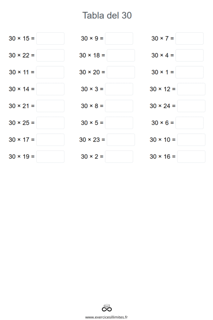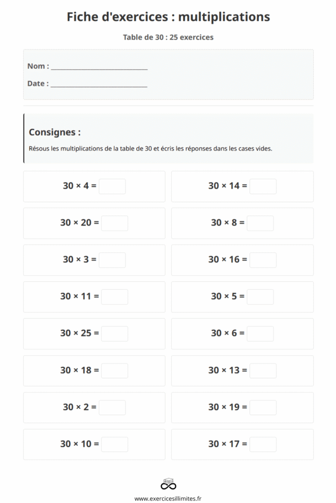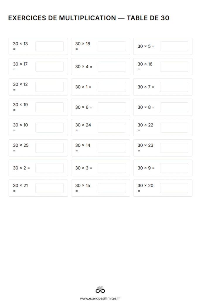 Ces exercices facilitent la mémorisation de la table de 30 et rendent l’apprentissage plus amusant.