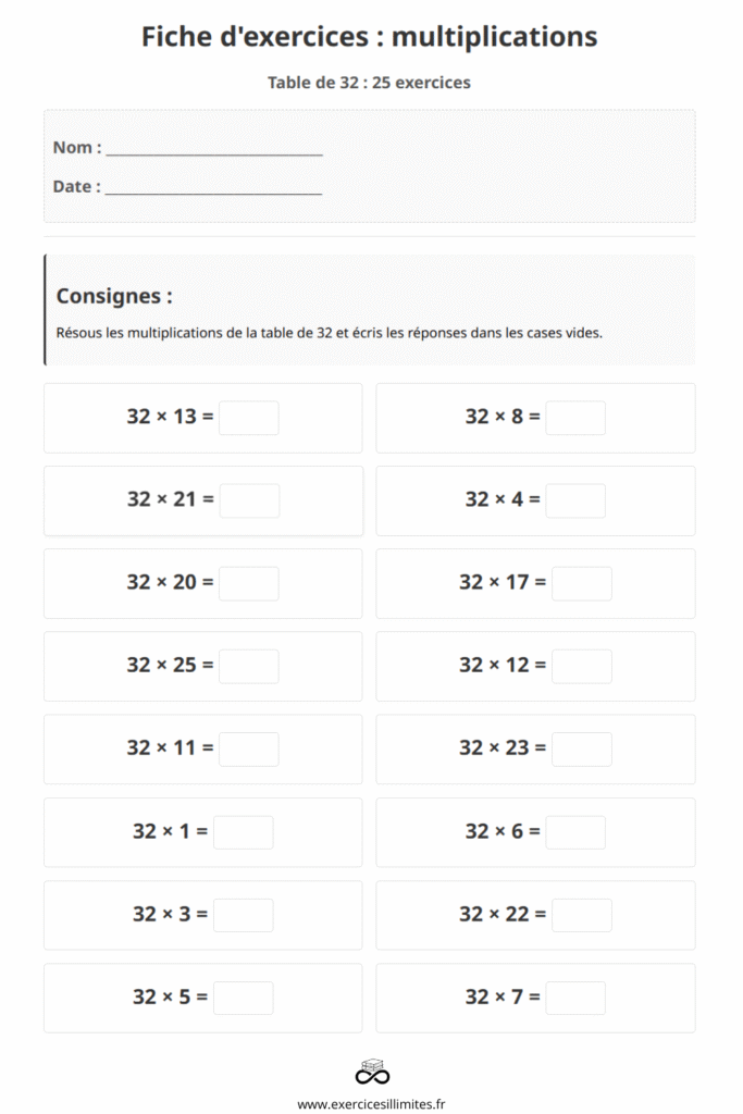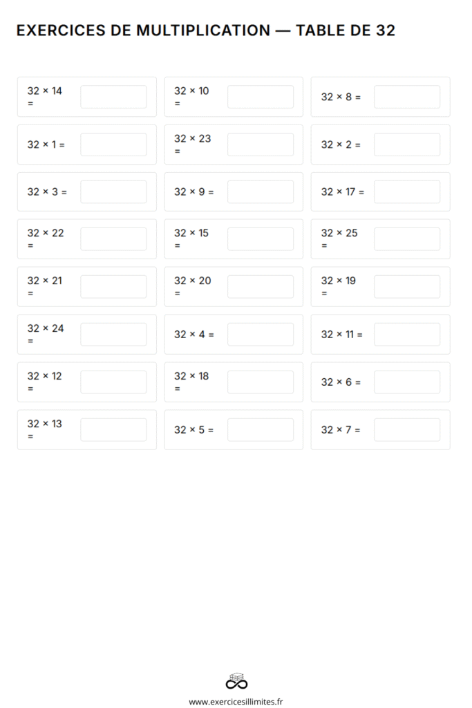 En complément, télécharge des fiches de la table de 32 multiplication. Elles contiennent des exercices progressifs, idéaux pour réviser à la maison ou à l’école.
