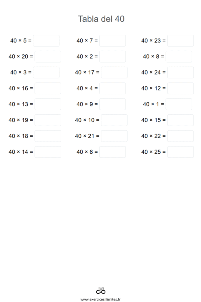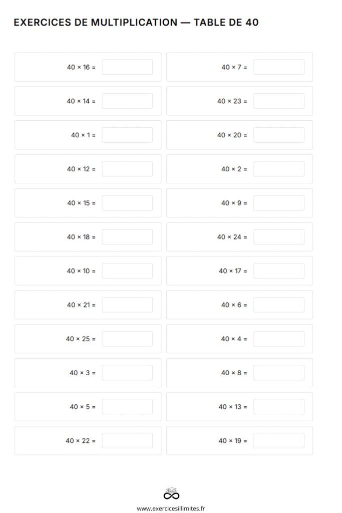 Fiches de travail à imprimer – tables de multiplication 40