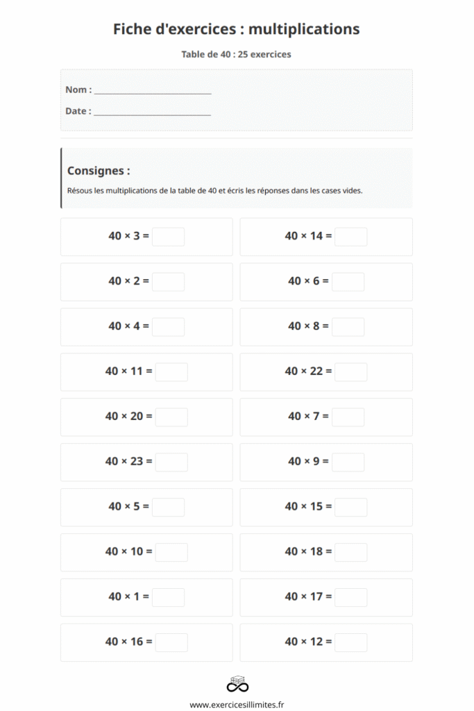 En complément, télécharge des fiches de la table de 40 multiplication. Elles proposent des exercices progressifs, parfaits pour réviser efficacement à l’école ou à la maison.