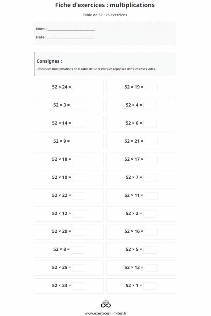 En complément, télécharge des fiches de la table de 52 multiplication. Elles contiennent des exercices progressifs, parfaits pour réviser efficacement à la maison ou à l’école.