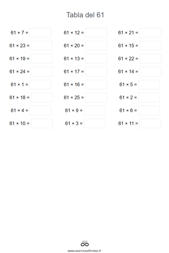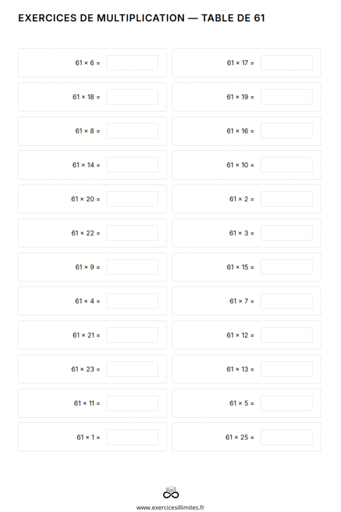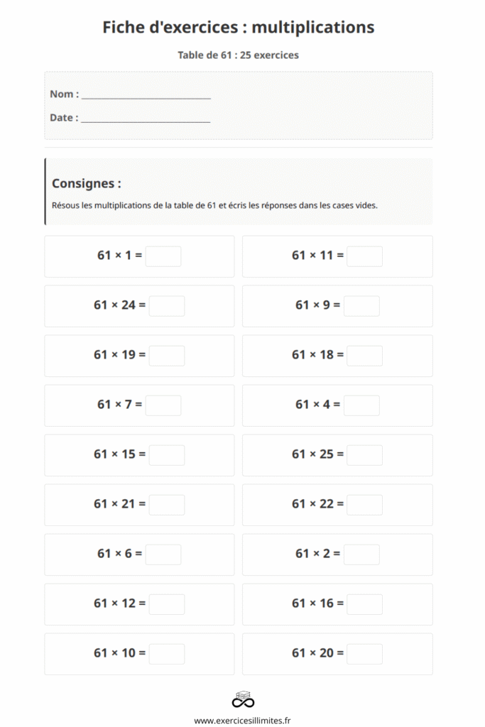 En complément, télécharge des fiches de la table de 61 multiplication. Elles proposent des exercices progressifs, parfaits pour réviser efficacement à la maison ou à l’école.