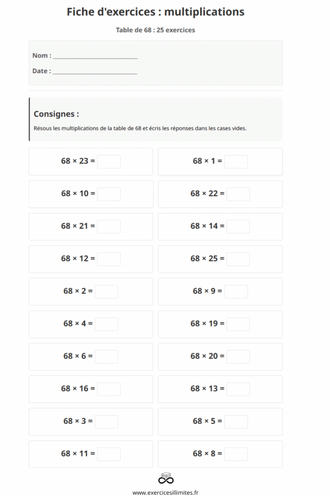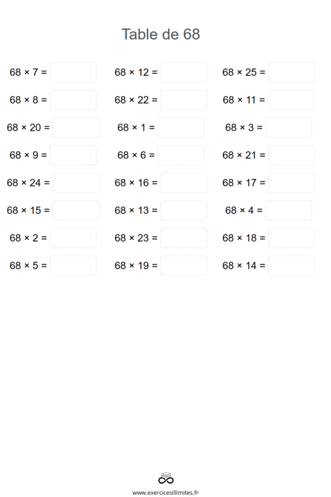 En complément, télécharge des fiches de la table de 68 multiplication. Elles proposent des exercices progressifs, parfaits pour réviser efficacement à la maison ou à l’école.