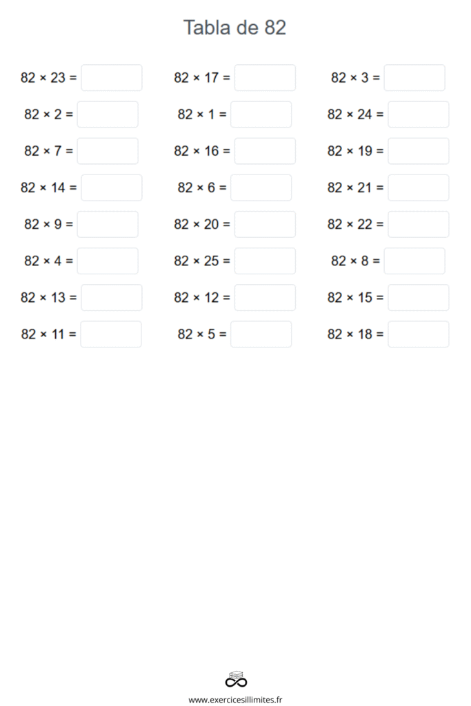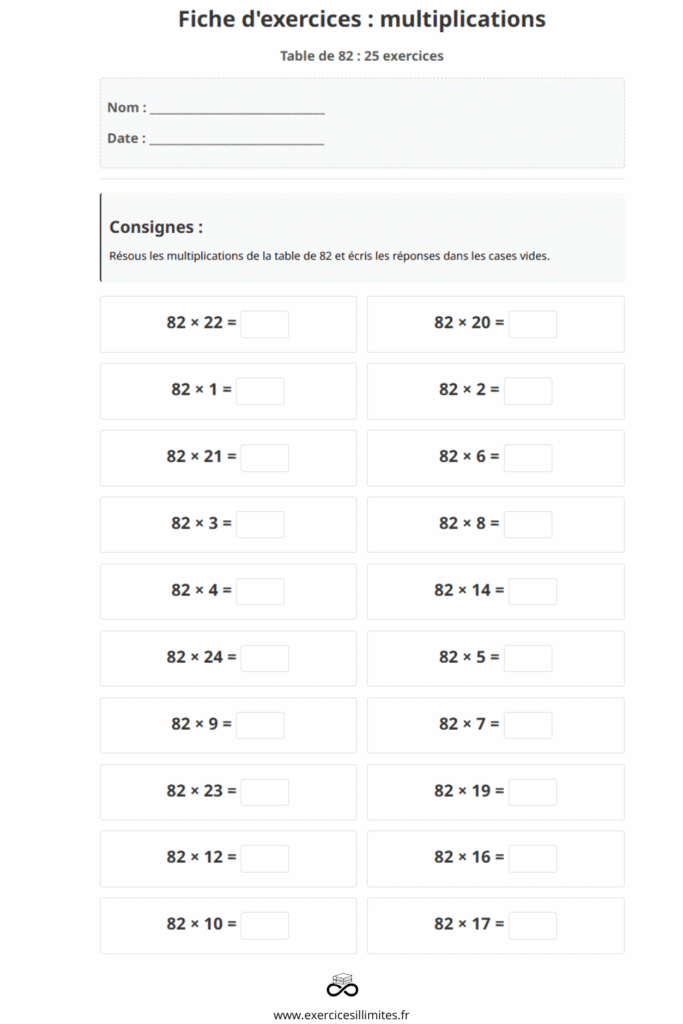 Une évaluation simple des tables de multiplication de 82 permet de tester tes acquis et de mesurer ta progression.